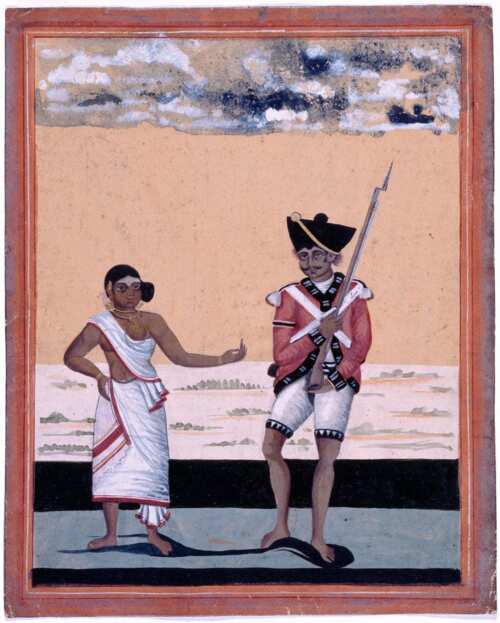 Immagine: Sepoy of Madras Native Infantry and his wife, 1810, Watercolour on Oriental paper by a Company artist, Tanjore, Army Museum, out of copyright, link qui